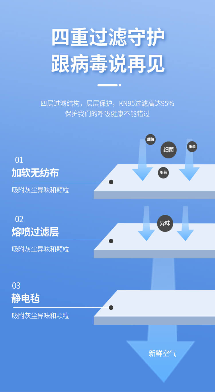 >用于防護顆粒物,對非油性顆粒物及粉塵的過濾效率在95%以上; >高效濾芯層,阻隔非油性顆粒物及粉塵。