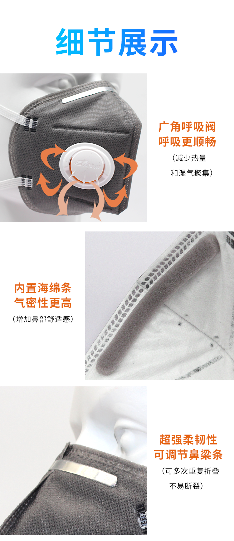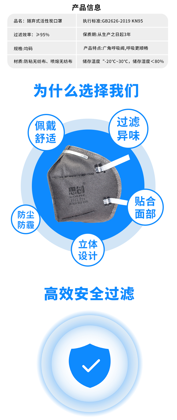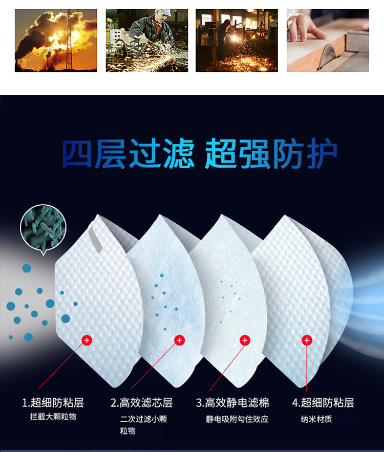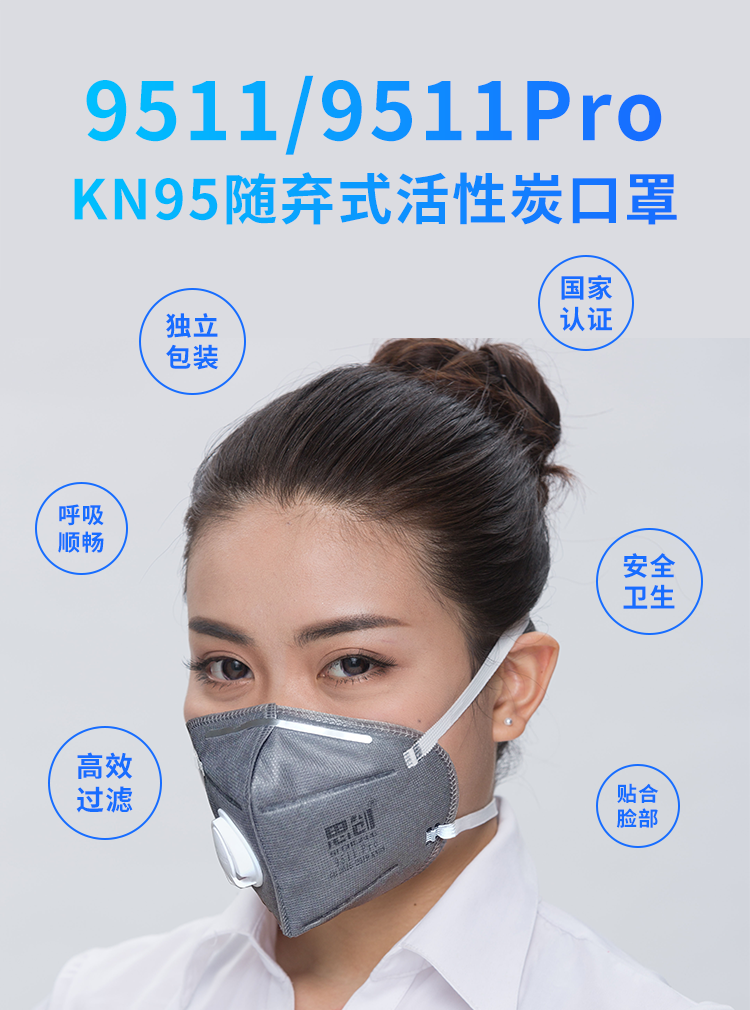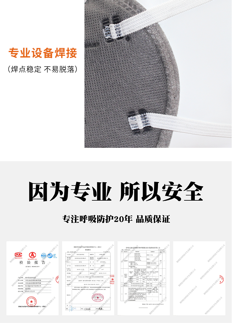 >用于防護顆粒物,對非油性顆粒物及粉塵的過濾效率在95%以上; >橢圓呼氣閥,適合溫熱環境或長時間重體力勞動使用; >高效活性碳層,有效降低異味。