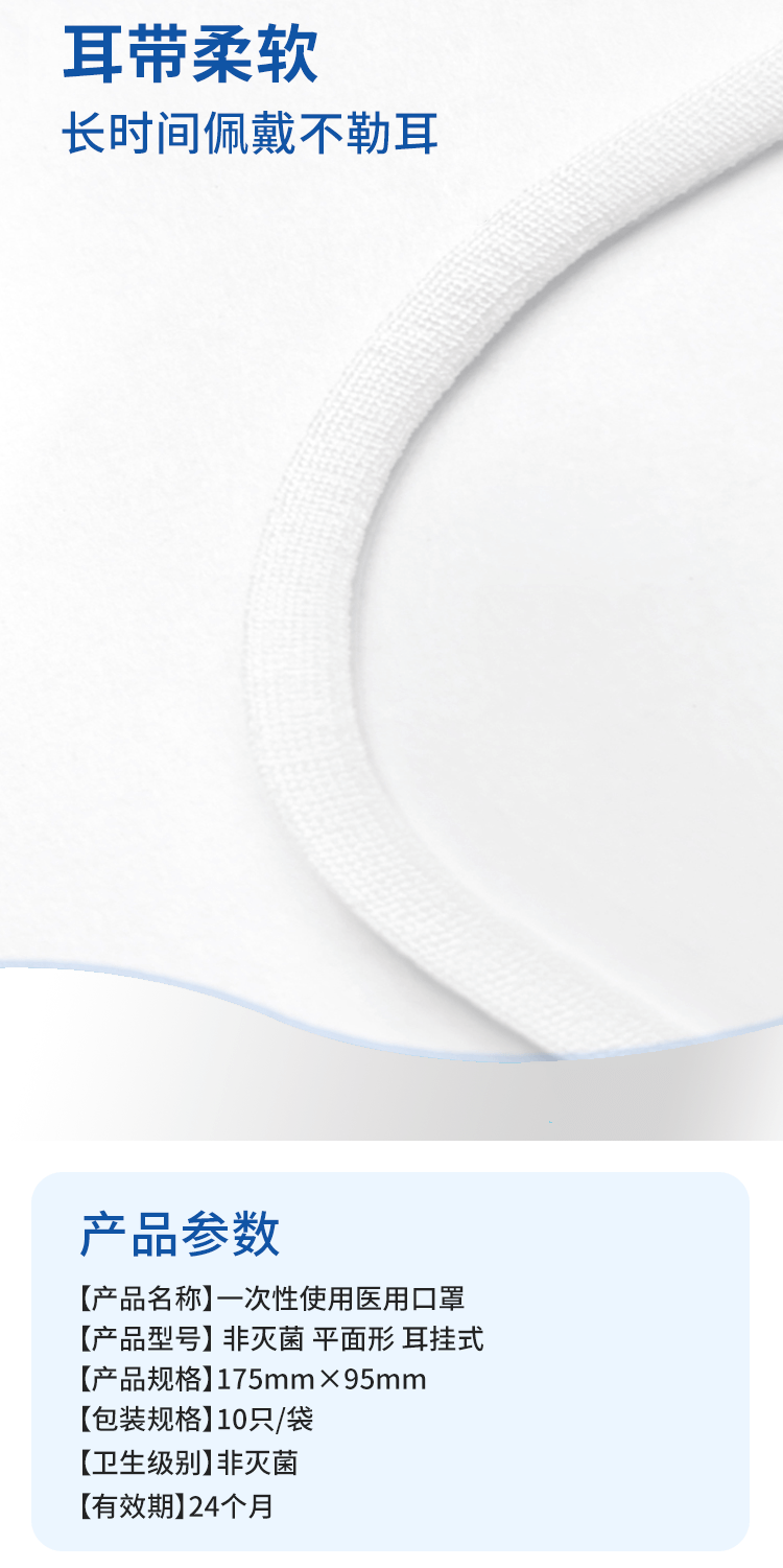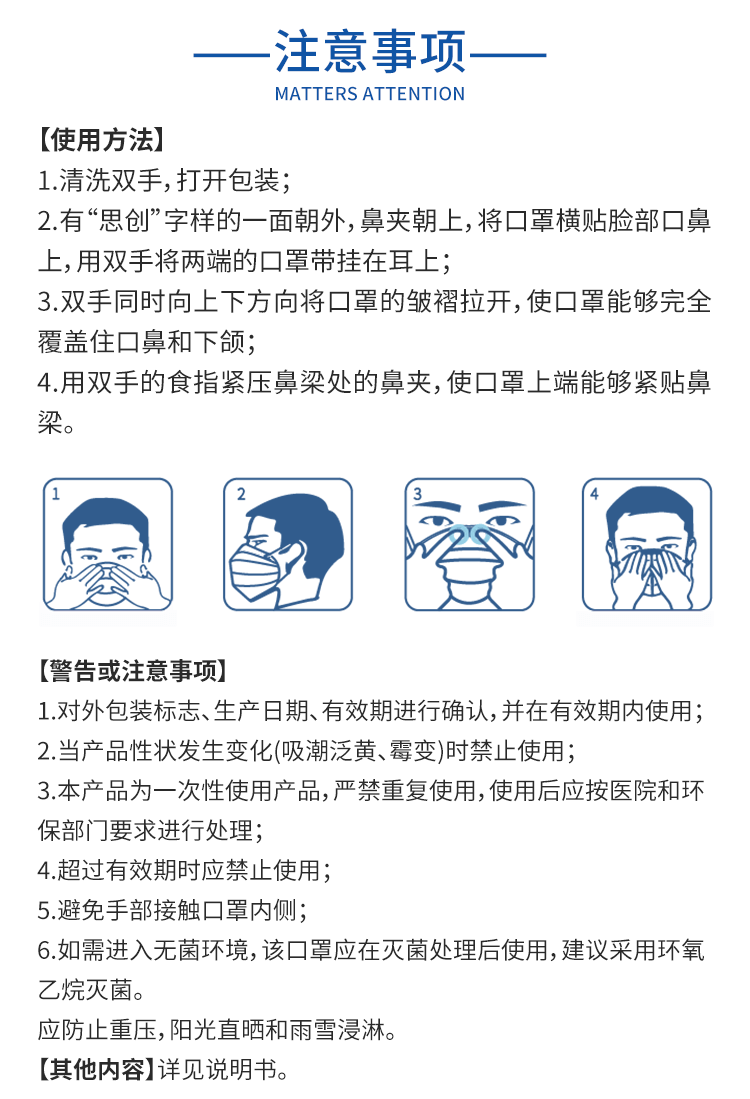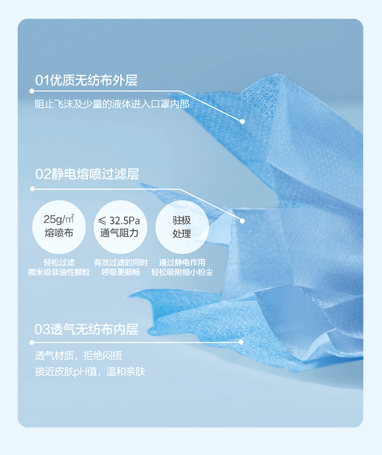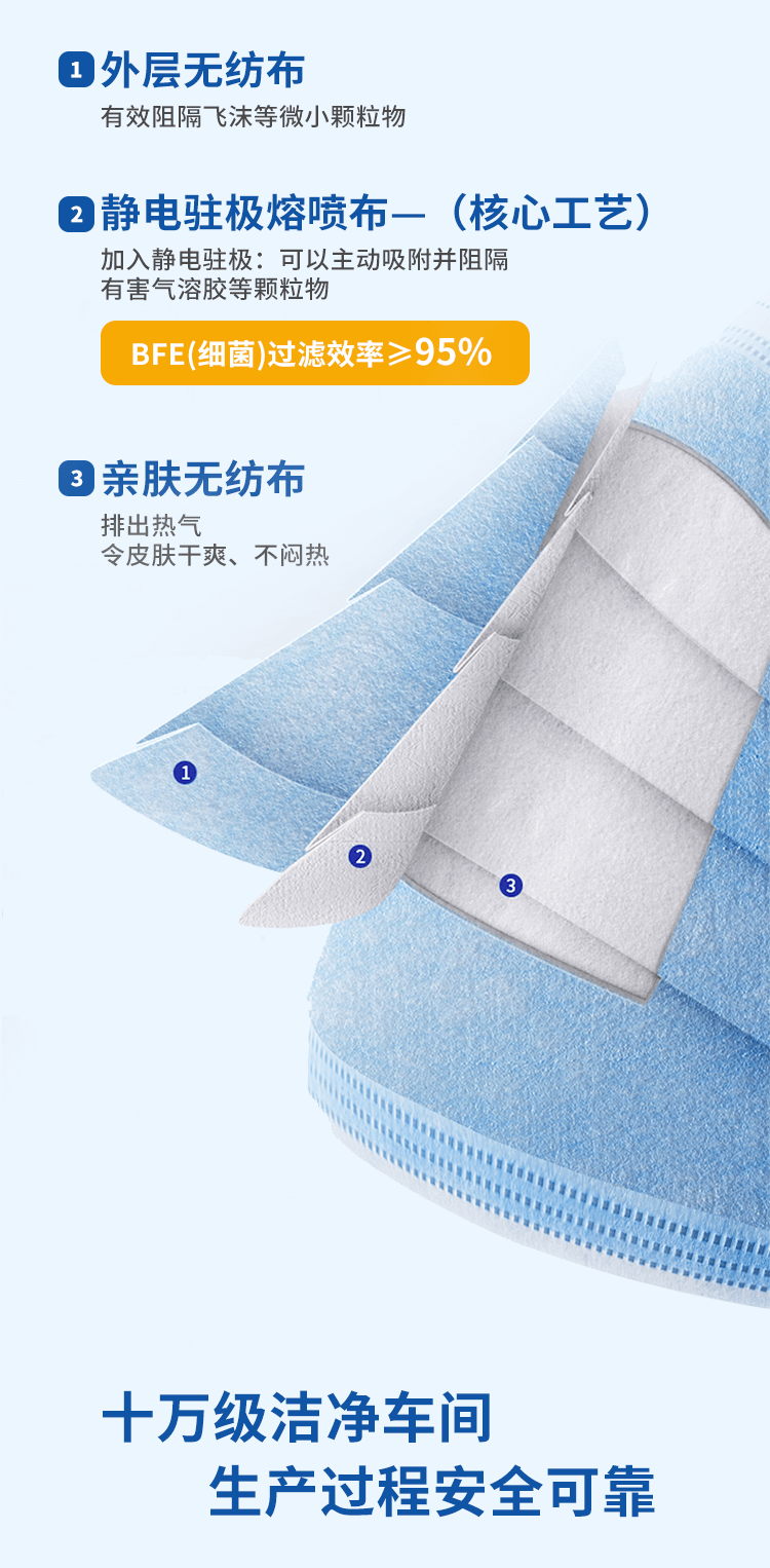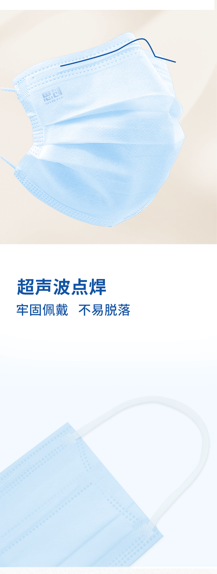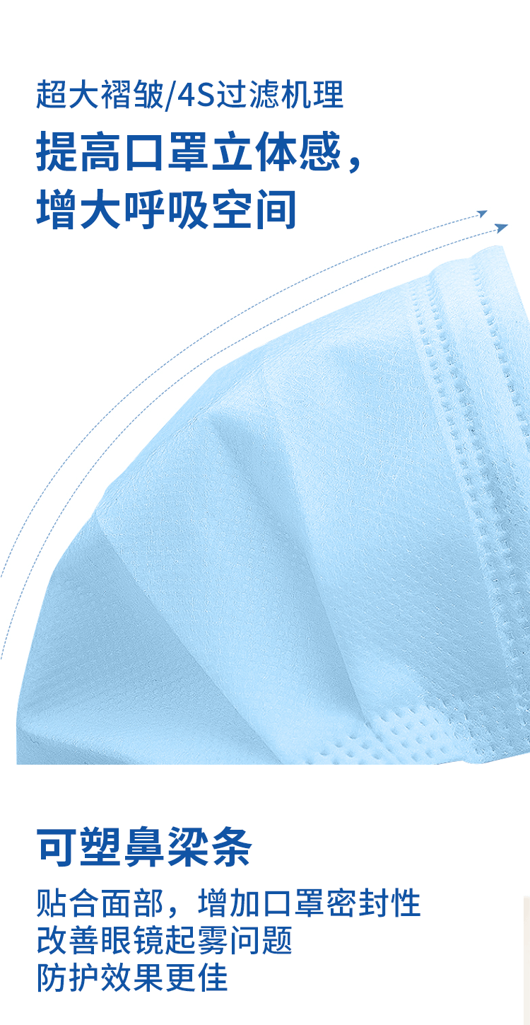 >優良無紡布外層,阻止飛沫及少量的液體進入口罩內部。 >靜電熔噴過濾層,輕松過濾微米級非油性顆粒物,靜電吸附細小粉塵。 >透氣無紡布內層,拒絕悶捂,接近皮膚PH值,溫和親膚。 >十萬級潔凈車間,生產過程安全可靠。 >超大褶皺4S過濾機理,提高口罩立體感,加大呼吸空間。 >可塑鼻梁條,增加口罩密封性,改善眼鏡起霧問題,防護效果更佳。 >耳帶超聲波點焊,牢固佩戴不易脫落。
